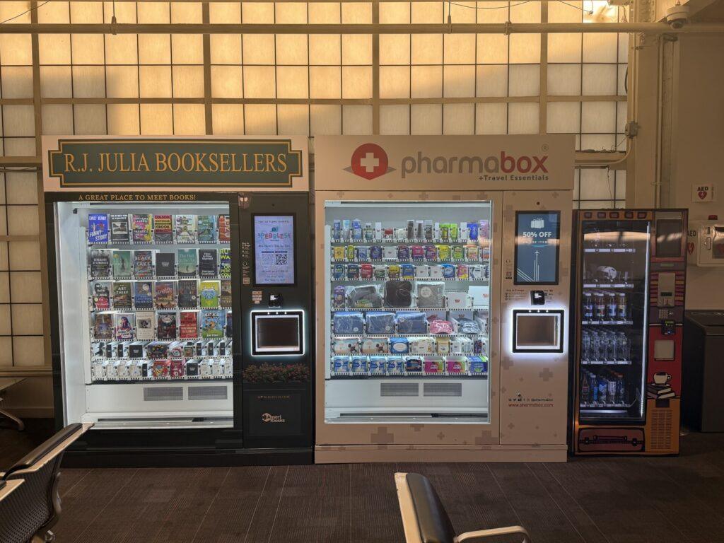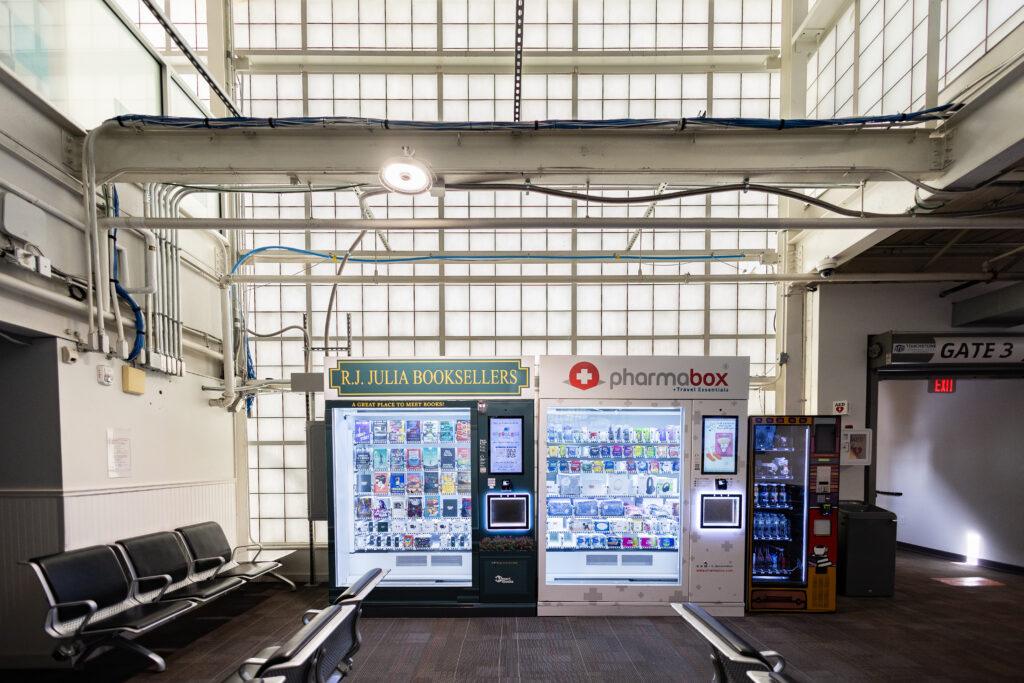 Shop automated retail at the HVN Marketplace – featuring RJ Julia Booksellers with a curated selection of books and electronics, and PharmaBox, your go-to for all travel essentials. Each automated retailer showcases local small businesses, including Pebbles Toy Store of New Haven and Pearls & Plaid of Old Saybrook.